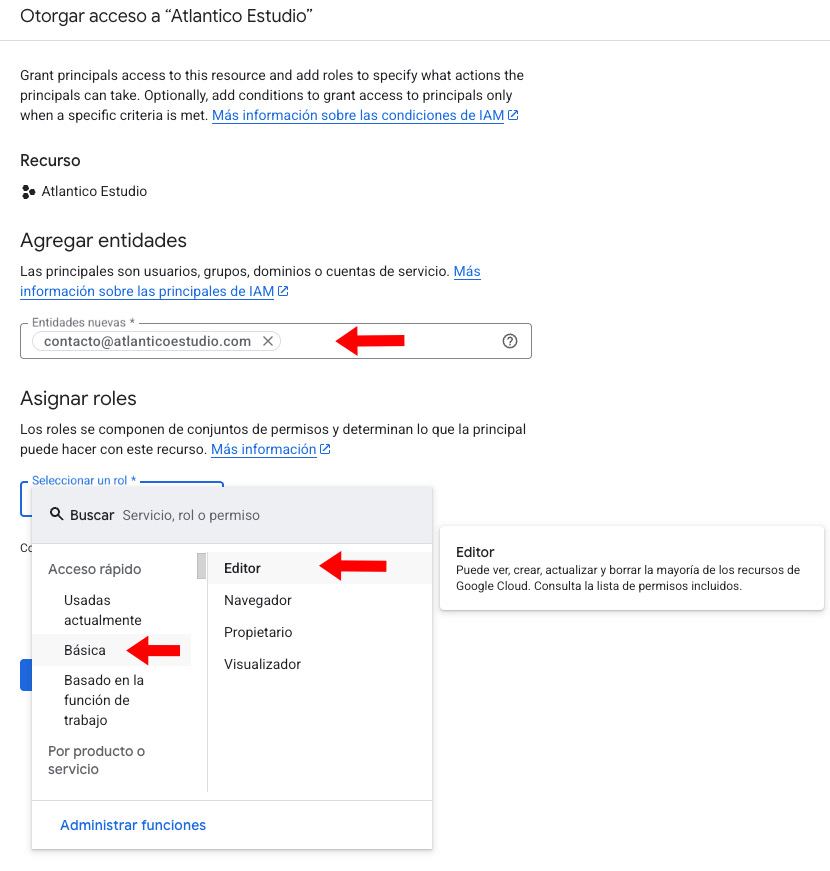Para poder trabajar en tu proyecto de Google Cloud (configurar APIs, integrar servicios o gestionar recursos), necesitamos que nos des acceso como editores.