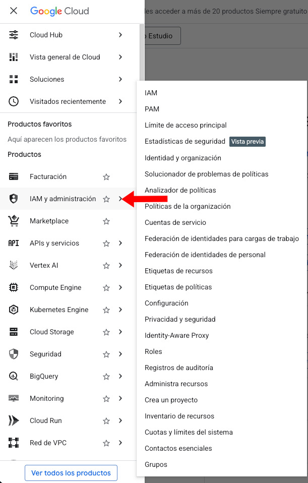En el menú lateral izquierdo, hacé clic en IAM y administración y luego seleccioná IAM.